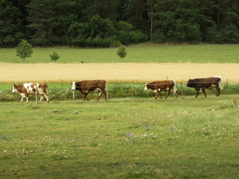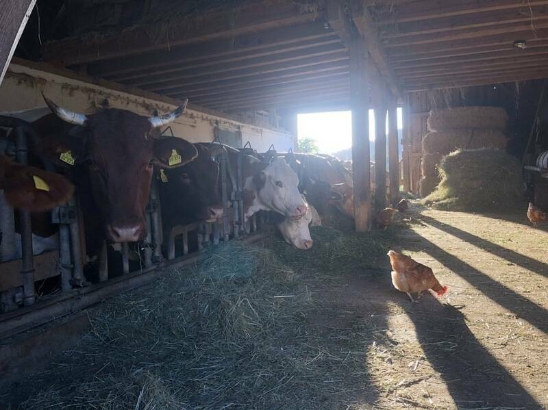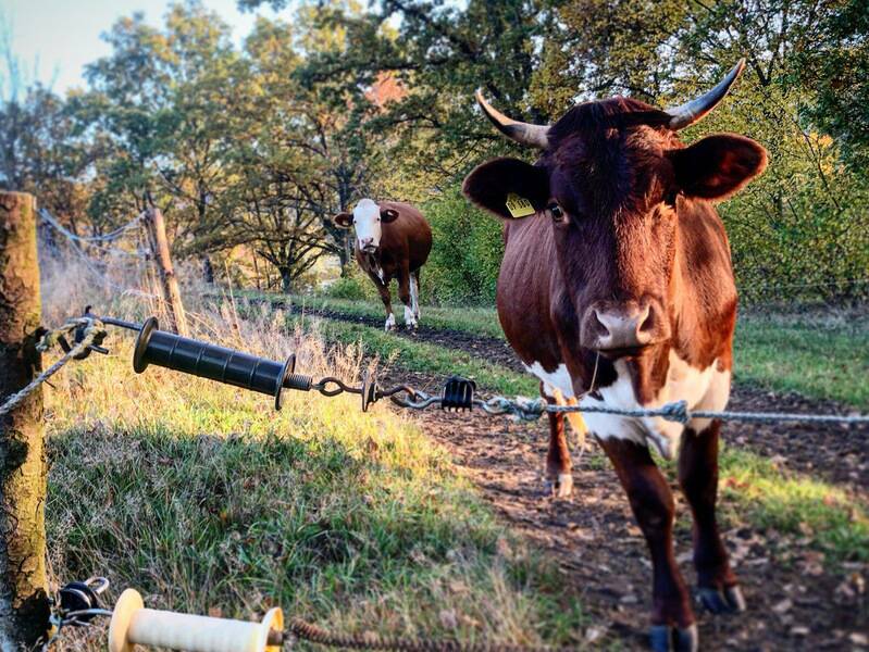Unsere kleine Rinderherde besteht aus Pinzgauer, Fleckvieh und Hereford. Die Kälbchen laufen mit ihren Müttern auf der Weide mit. Wir füttern eigenes Heu, Getreide und Gras, verwenden unseren eigenen Mist und produzieren eigenes Stroh für die Tiere.